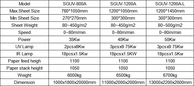 4 : Az UV rész elfogadja a 8 -at-A 12 kW -os állítható elektronikus fényforrás, amely jelentősen javította a biztonsági teljesítményt, mint a hagyományos feszültségforrás -fényforrás. A fényforrás automatikusan beállíthatja a fényerőt, mint a gép futási sebességének megváltoztatása, amely 30 -ról megváltoztatható% 100 -ig%- Így az átlagos energiafogyasztást több mint 30 takarítja meg%-